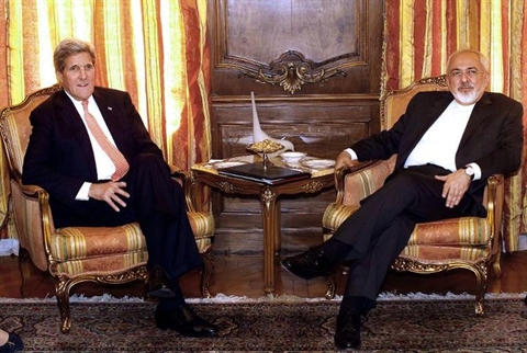 | Le secrétaire d'État américain John Kerry (gauche) et le ministre iranien des Affaires étrangères Javad Zarif, le 27 avril aux Nations unies à New York. |