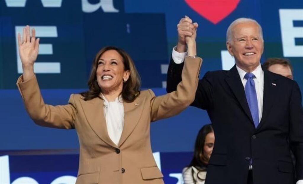 | Le président américain Joe Biden et sa vice-présidente Kamala Harris lors de la Convention nationale démocrate à Chicago, le 20 août. |