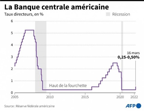 Cette première hausse, d'un quart de point de pourcentage (0,25%), sera suivie de plusieurs autres. Et plusieurs responsables de la Fed, dont son président, ont averti qu'ils pourraient être plus agressifs dans les prochains mois, et relever les taux d'un demi-point directement, à une ou plusieurs reprises.