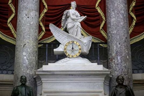 | L’horloge dans le hall du Capitole, à Washington, jeudi 9 février 2018. |