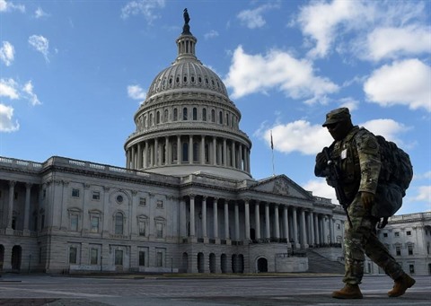 | Un membre de la Garde Nationale patrouille devant le Capitole à Washington le 6 mars. |