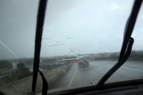| Fortes pluies sur une route de la Nouvelle-Orléans avant le passage de l'ouragan Barry, le 12 juillet en Louisiane. |
