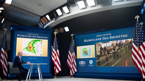 | Le président Joe Biden reçoit un briefing de responsables de l'Agence américaine de gestion des catastrophes naturelles, à la Maison Blanche le 28 août. |