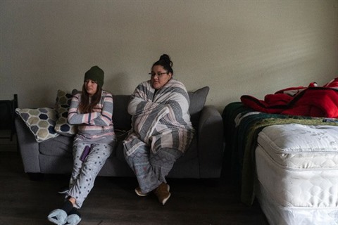 | Des habitantes de Houston, au Texas, tentent de se réchauffer dans leur appartement alors que le courant y a été coupé, le 16 février. |