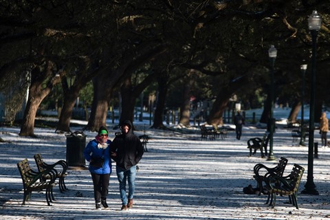 | Des promeneurs dans un parc enneigé de Houston, au Texas, le 15 février. |