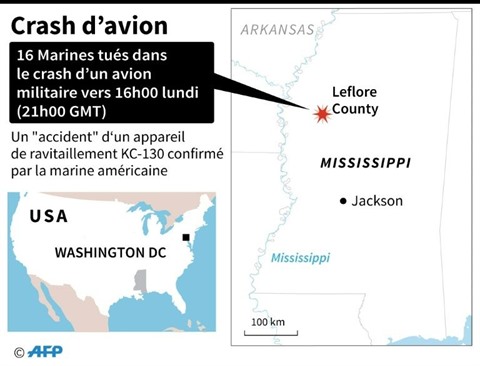 L'appareil KC-130, utilisé pour le ravitaillement en carburant et transport de troupes, s'est écrasé lundi 10 juillet dans un champ du Mississippi, dans le sud des États-Unis, vers 16h00 (21h00 GMT), ont-ils précisé dans un communiqué.