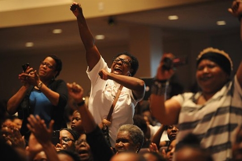 | Meeting de soutien à Michael Brown, le jeune Noir de 18 ans non armé, mort sous les balles de la police le 9 août, en présence de Jesse Jackson, le 17 août à Ferguson, dans le Miss |