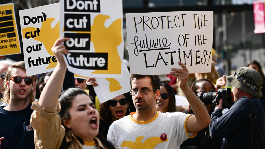 | Des journalistes du Los Angeles Times manifestent contre des licenciements dans la rédaction, à Los Angeles le 19 janvier. |