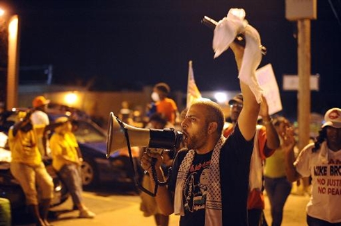 | Un homme avec un haut-parleur défile dans une rue de Ferguson, dans le Missouri, après la mort d'un jeune Noir, le 19 août. |
