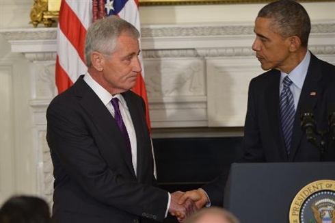 | Le président Barack Obama (droite) et le secrétaire à la Défense démissionnaire Chuck Hagel, le 24 novembre à Washington |