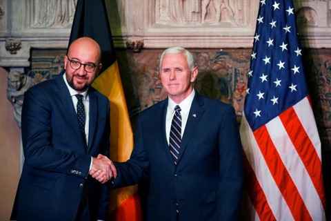 | Le Premier ministre belge Charles Michel (gauche) et le vice-président américain Mike Pence, le 9 février à Bruxelles |