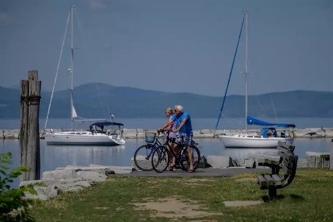| Des cyclistes devant le lac Champlain à Burlington (Vermont), le 29 juin. |