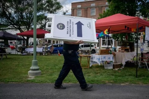 "On s'est rendu compte qu'il fallait aller les chercher", explique Ellen Monger, infirmière, en attendant d'éventuels futurs vaccinés sur un marché de produits locaux de la bourgade de Northfield, à 70 km de Burlington.