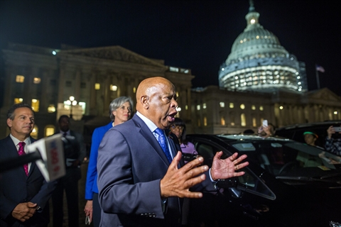 | Le parlementaire démocrate de Géorgie, John Lewis, parle à ses partisans après avoir mis fin le sit-in, le 23 juin à Washington. |
