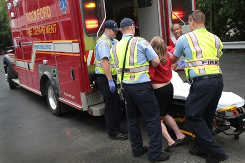 | Les pompiers aident une femme victime d'une overdose de médicaments le 14 juillet 2017 à Rockford, dans l'Illinois. |