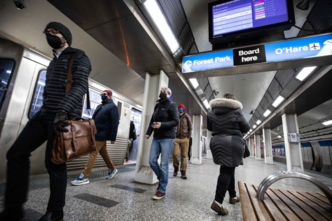 | Les gens portent des masques pour prévenir les contaminations du COVID-19 à Chicago, aux États-Unis. |
