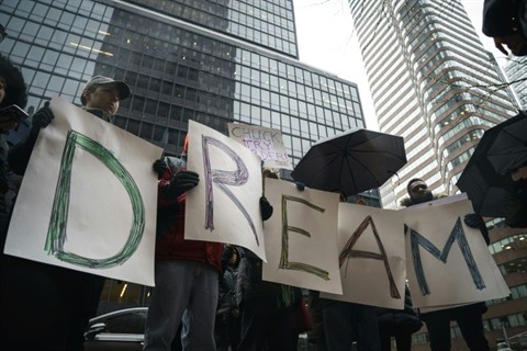 | Des militants manifestent leur soutien aux "Dreamers", devant le bureau du chef de la minorité démocrate au Congrès, Chuck Schumer, le 17 janvier à New York. |
