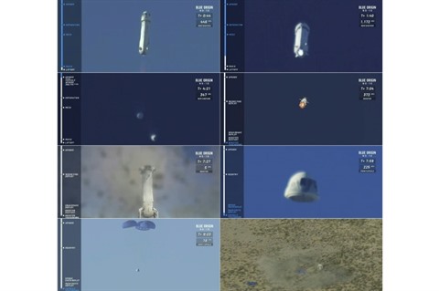 | Montage d'images tirées d'une vidéo lors du 10e vol d'essai de la fusée New Shepard de Blue Origin, le 23 janvier au Texas. |