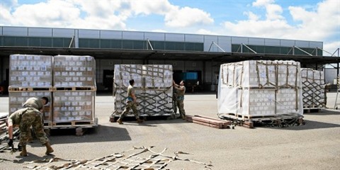 | Un vol de l’US Air Force a acheminé, depuis l’Allemagne, cette cargaison de lait maternisé à destination des États-Unis. |
