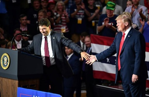 | Le candidat républicain dans la 12e circonscription de l'Ohio, Troy Balderson (gauche) et le président américain Donald Trump le |