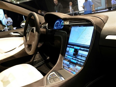 | Un écran de contrôle à l'intérieur d'une voiture électrique Tesla "Model S", à Hawthorne (États-Unis), le 26 mars 2009. |