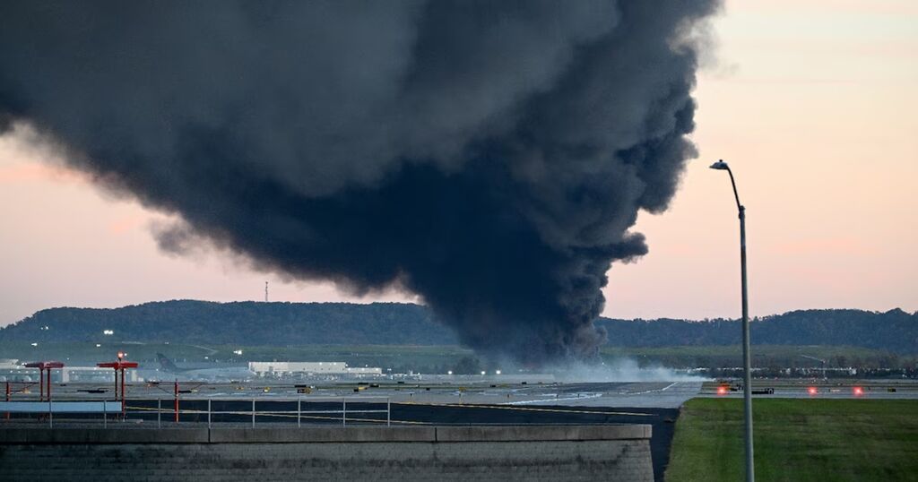 | De la fumée s'élève de l'accident aérien près de l'aéroport de Louisville, dans le Kentucky, le 4 novembre. |