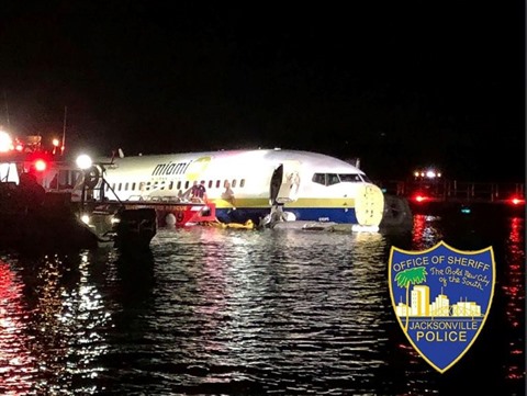 | Image fournie le 3 mai par le Sheriff de Jacksonville, en Floride, d'un Boeing 737 ayant fini son atterrissage dans une rivière. |