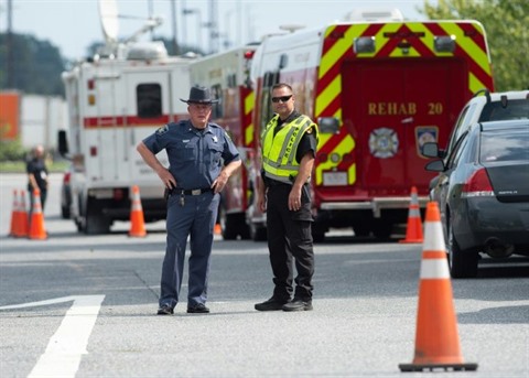 | La police bloque les routes autour d'une zone industrielle où trois personnes sont mortes et trois autres blessées dans une fusillade le 20 septembre à Aberdeen, Maryland. |