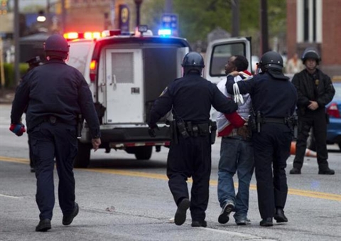| La police arrête un manifestant à Baltimore le 25 avril lors d'un rassemblement dénonçant la mort d'un Noir suite à son arrestation par la police. |