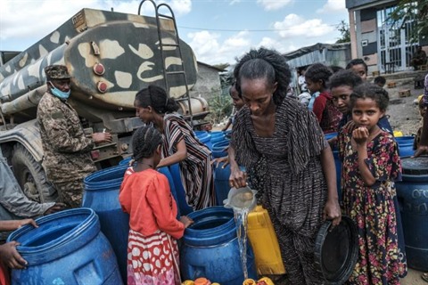 | Collecte d'eau distribuée par l'armée éthiopienne dans le village de Hadaelga, à l'ouest d'Alamata, dans la région éthiopienne du Tigré, le 10 décembre |