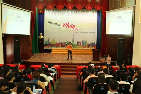 | Les participants écoutent un étudiant vietnamien partager ses expériences d'étude en France. |