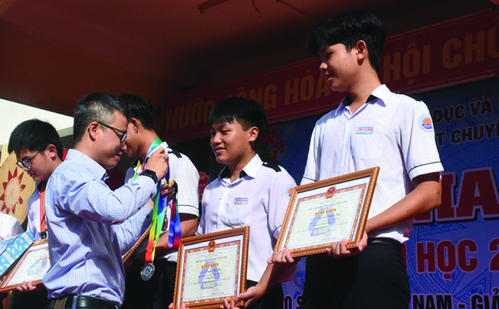 | Le Pr. Nam remet des médailles à des élèves du Lycée d’excellence Luong Van Chanh primés aux olympiades organisés dans le Sud. |