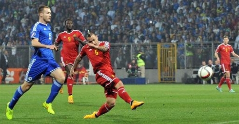 | Le milieu belge Radja Nainggolan (droite) égalise pour son équipe face à la Bosnie Herzégovine en qualification pour l'EURO-2016, le 13 octobre à Zenica |