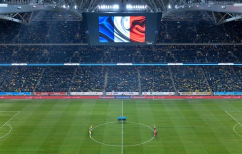 | Minute de silence en hommage aux victimes des attentats de Paris, avant le match de barrage qualificatif pour l'Euro-2016 entre la Suède et le Danemark, le 14 novembre à Solna (Suède). |