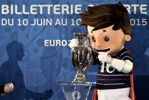 | La mascotte de l'Euro-2016 Super Victor et le trophée de la compétition lors de la conférence sur la billetterie et le calendrier, le 12 mai à Paris. |