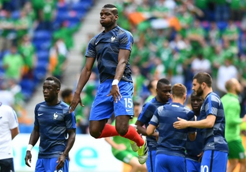 | Le milieu de l'équipe de France, Paul Pogba (centre), face à l'Irlande à l'Euro au Parc OL, le 26 juin. |