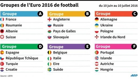 | Les six groupes de l'Euro 2016 à l'issue du tirage au sort. |