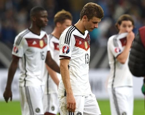 | Les joueurs allemands, tête basse, après le nul concédé à l'Eire en éliminatoires de l'EURO-2016, le 14 octobre à Gelsenkirchen. |