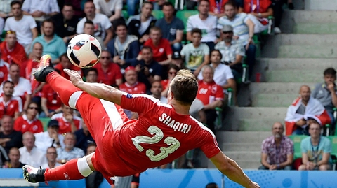 | Le milieu suisse Xherdan Shaqiri inscrit un but acrobatique face à la Pologne à l'Euro au stade Geoffroy-Guichard, le 25 juin. |