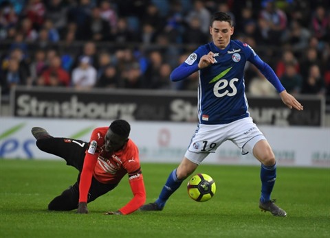 | Le milieu de Strasbourg, Anthony Caci (droite), lors du match de Ligue 1 face à Rennes, au stade de la Meinau, le 18 mai. |