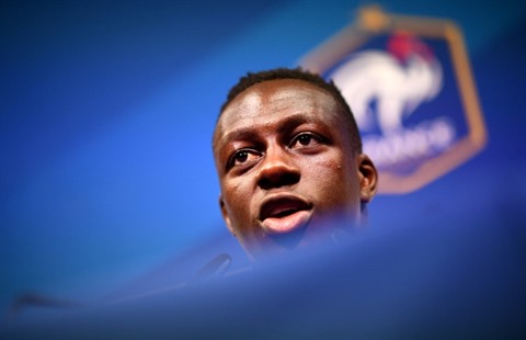 | Le défenseur des Bleus Benjamin Mendy en conférence de presse à Clairefontaine-en-Yvelines, le 30 mai 2018. |