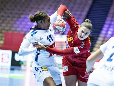 | La Française Aïssatou Kouyaté à la lutte avec la joueuse du Montenegro Djurdjina Jaukovic lors du 1er tour de l'Euro-2020 de handball le 4 décembre 2020 à Herning, au Danemark. |