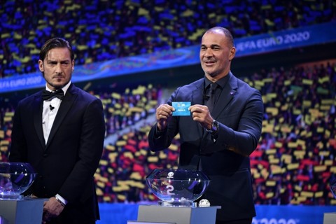 | L'ancien international néerlandais Ruud Gullit (droite) présente le papier France aux côtés de l'ancien international italien Francesco Totti lors du tirage au sort de l'Euro-2020, le 30 novembre à Bucarest. |