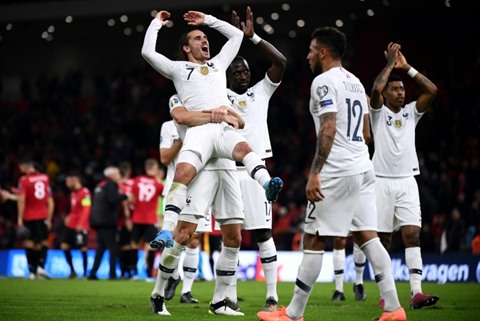 | Antoine Griezmann (gauche) et les Bleus exultent à l'issue de leur victoire en Albanie, le 17 novembre. |