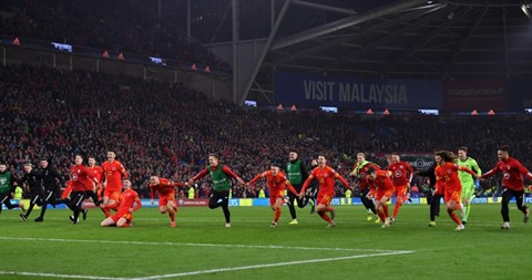 | Les Gallois fêtent leur qualification pour l'Euro à l'issue de la victoire sur la Hongrie à Cardiff, le 19 novembre. |