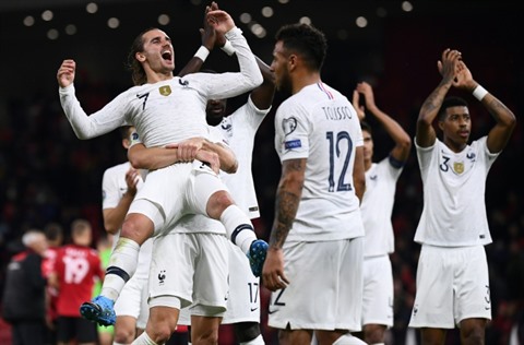 | Les joueurs de l'équipe de France, heureux, après avoir assuré leur qualification pour l'Euro-2020 en dominant l'Albanie à Tirana, le 17 novembre. |