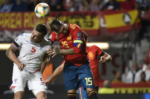 | Le capitaine de l'Espagnol Sergio Ramos (droite) au duel avec Bartal Wardum des Îles Féroé à Gijon, le 8 septembre. |