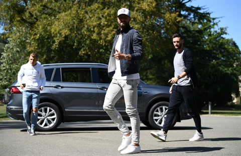 | Lucas Digne, Olivier Giroud et Hugo Lloris arrivent à Clairefontaine, le 2 septembre. |