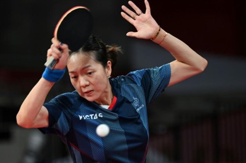 | La pongiste française Jia Nan Yuan, lors de la défaite de l'équipe de France face à Singapour, en 8e de finale aux Jeux olympiques de Tokyo 2020, le 2 août. |