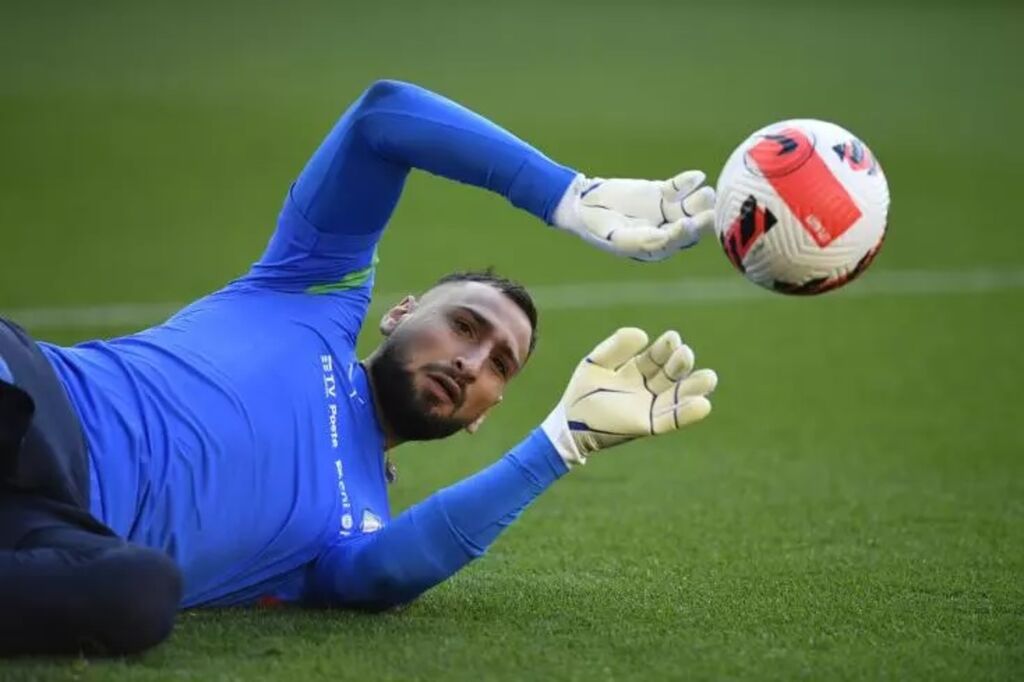 | Le gardien de but de l'équipe d'Italie Gianluigi Donnarumma à l'entraînement la veille du match de Ligue des nations contre l'Angleterre le 10 juin 2022. |